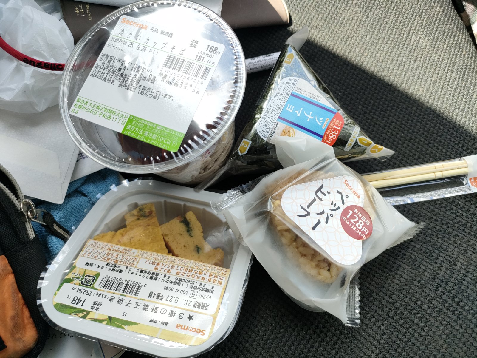 昼 セイコマ冷たい蕎麦おにぎり2個 玉子焼き